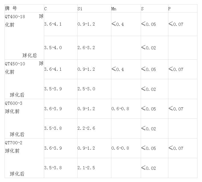 球鐵原鐵液應(yīng)高碳、低硅、低硫、低磷?刂坪昧虻暮,是生產(chǎn)球鐵的一個重要條件。幾種牌號的球鐵的化學(xué)成分見表2。